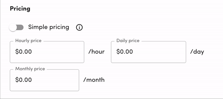 - Pricing - You can determine the hourly, daily, and monthly price for spots here. If you use the simple pricing setting, a daily and monthly price will be calculated (with a suitable discount) based on the hourly pricing